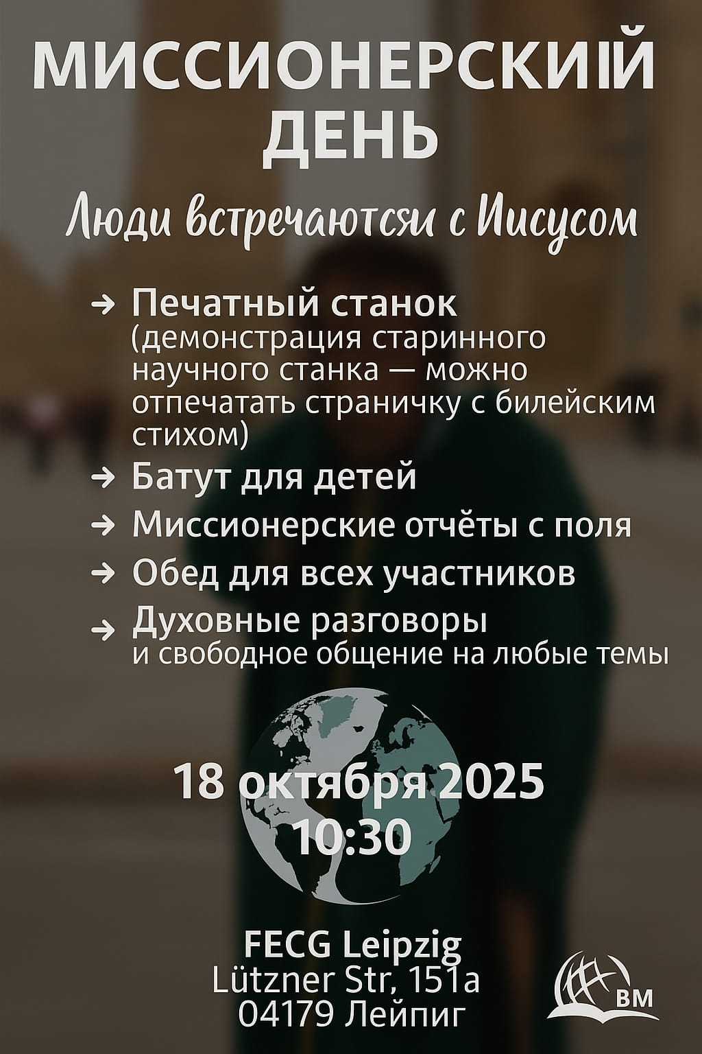 Каждое воскресенье в 10:00 богослужение на немецком и русском языке, на которое мы вас сердечно приглашаем.